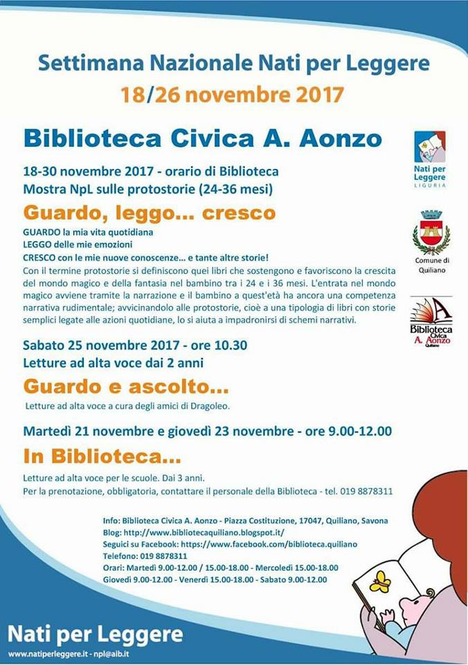 L’asilo Vadone collabora regolarmente con la biblioteca civica A.Aonzo di Quiliano. Grazie al prezioso lavoro della bibliotecaria Cristina riusciamo ad organizzare eventi e laboratori di lettura in biblioteca, anche con i più piccoli. Anche quest’anno i bambini dell’asilo Vadone hanno partecipato con grande entusiasmo all’iniziativa Guardo, leggo..cresco.